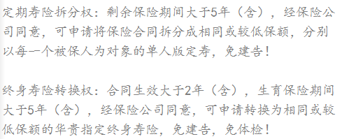 华贵甜蜜家大麦2021的两大转换权益有定期寿险拆分权和终身寿险拆分权,具体内容请看以下图: