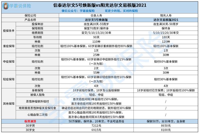 刚好,这两家公司今年有推出名字相像的重疾险——信泰人寿达尔文5号焕新版、阳光人寿达尔文易核版2021,就直接看看这两款产品对比情况如何,先看对比图:
