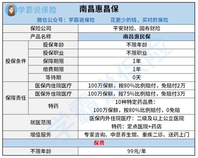 这款保险可是南昌首个惠民医疗险产品!据说一年99元就能享受300万元的医疗保障,并且医保外的费用也能报销。