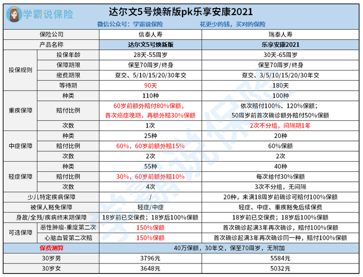 为了公平,学姐选取了两家保险公司人气都比较高的产品,做了对比图: