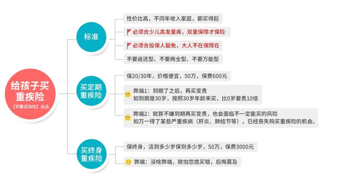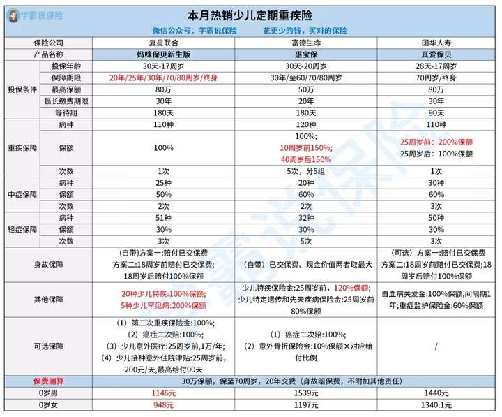 另外的就是很多家长会犹豫给孩子买重疾险是保定期还是保终身,要学姐说真不需要纠结那么多,主要还是看钱包鼓不鼓。有3千以上预算的首选终身,没预算的就不要勉强了,买个保30年,先把保额做足以后再升级成终身的也可以。