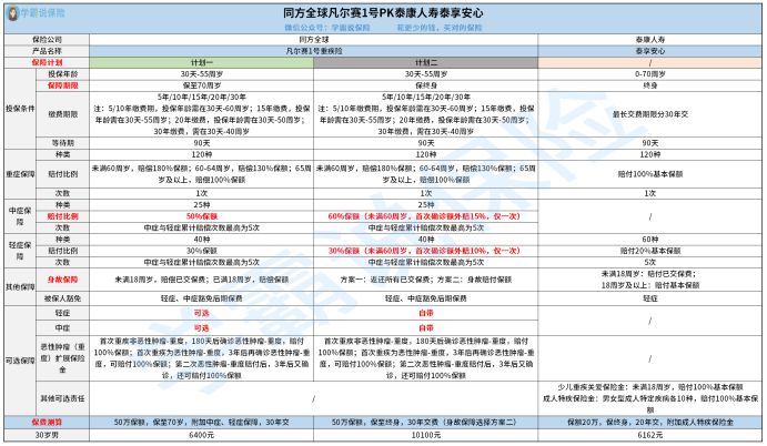 学姐这就为大家奉上同方全球人寿凡尔赛1号和信泰人寿的泰享安心重疾险对比表: