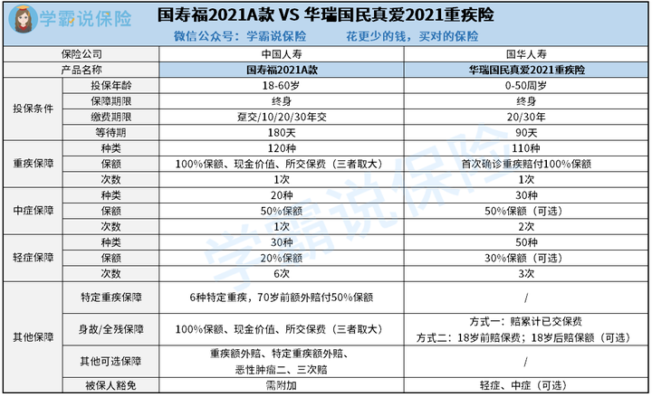 二、中国人寿VS国华人寿,谁的产品更靠谱?学姐分别选了中国人寿旗下的国寿福2021A款重疾险和国华人寿旗下的华瑞国民臻爱2021重疾险,接下来我们直接来看保障图吧: