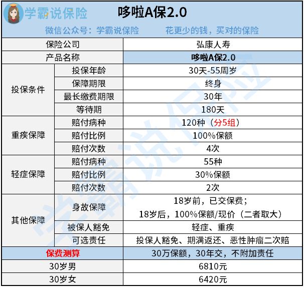 看完了哆啦A保2.0重疾险的保障内容,我们发现它是一款终身重疾险产品,投保年龄为30天-55周岁,等待期为180天。