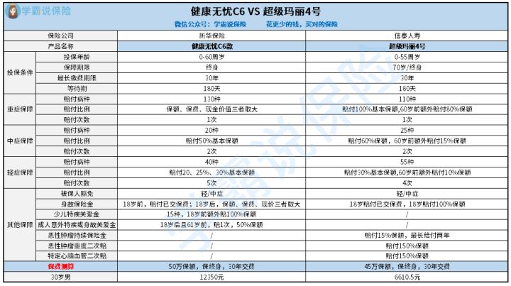 一、新华保险、信泰人寿重疾险对比学姐这里分别选了新华保险和信泰人寿两家的主推款——健康无忧C6和超级玛丽4号给大家分析一下,话不多说,咱直接上对比图: