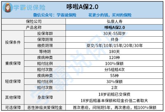 总的来说,哆啦A保2.0的重疾保障和轻症保障还是很不错的,缴费期限也很灵活,不足则是缺少了中症保障。