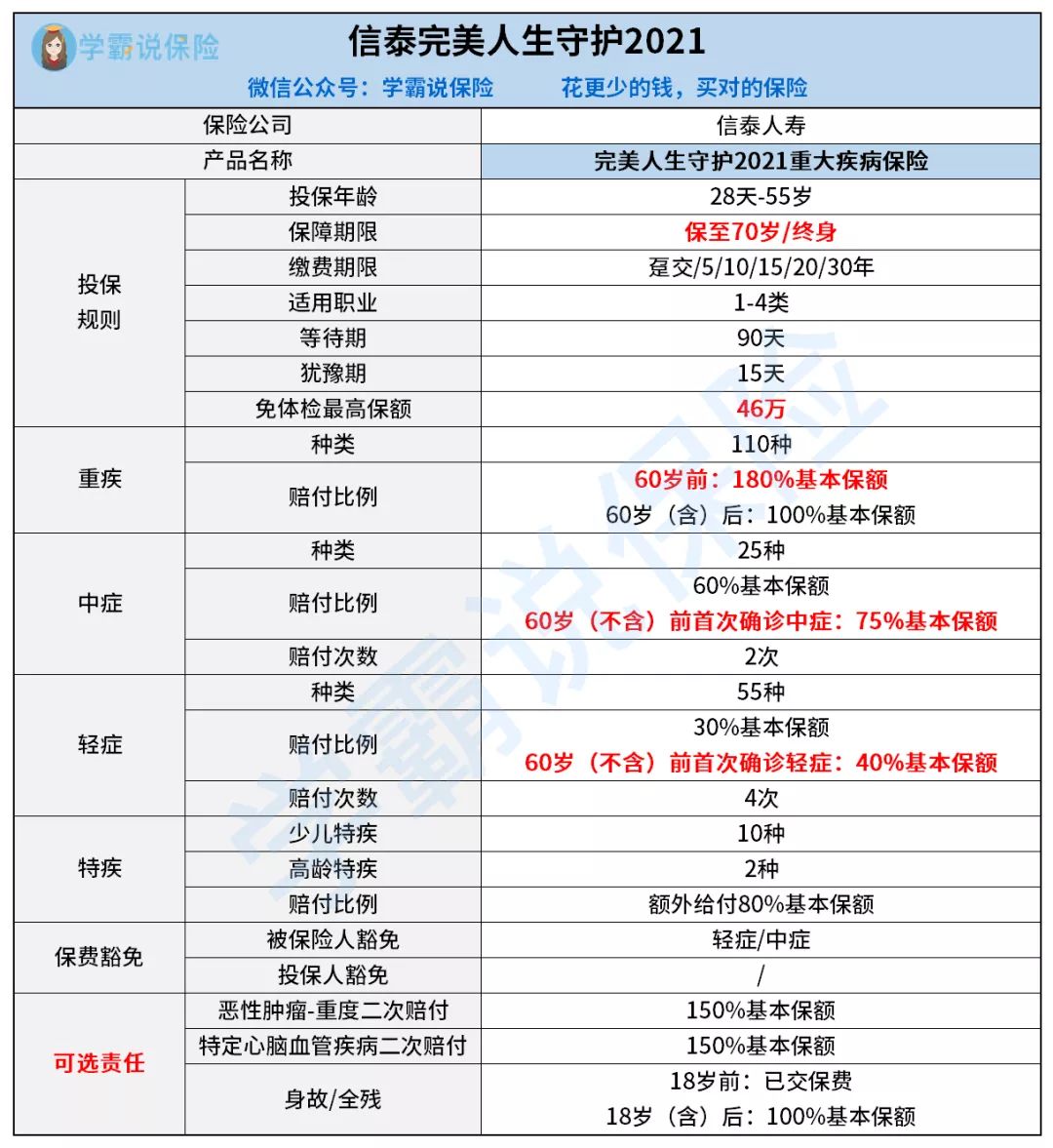 文章开始之前,学姐先为大家奉上信泰完美人生守护2021与热门重疾险的对比表: