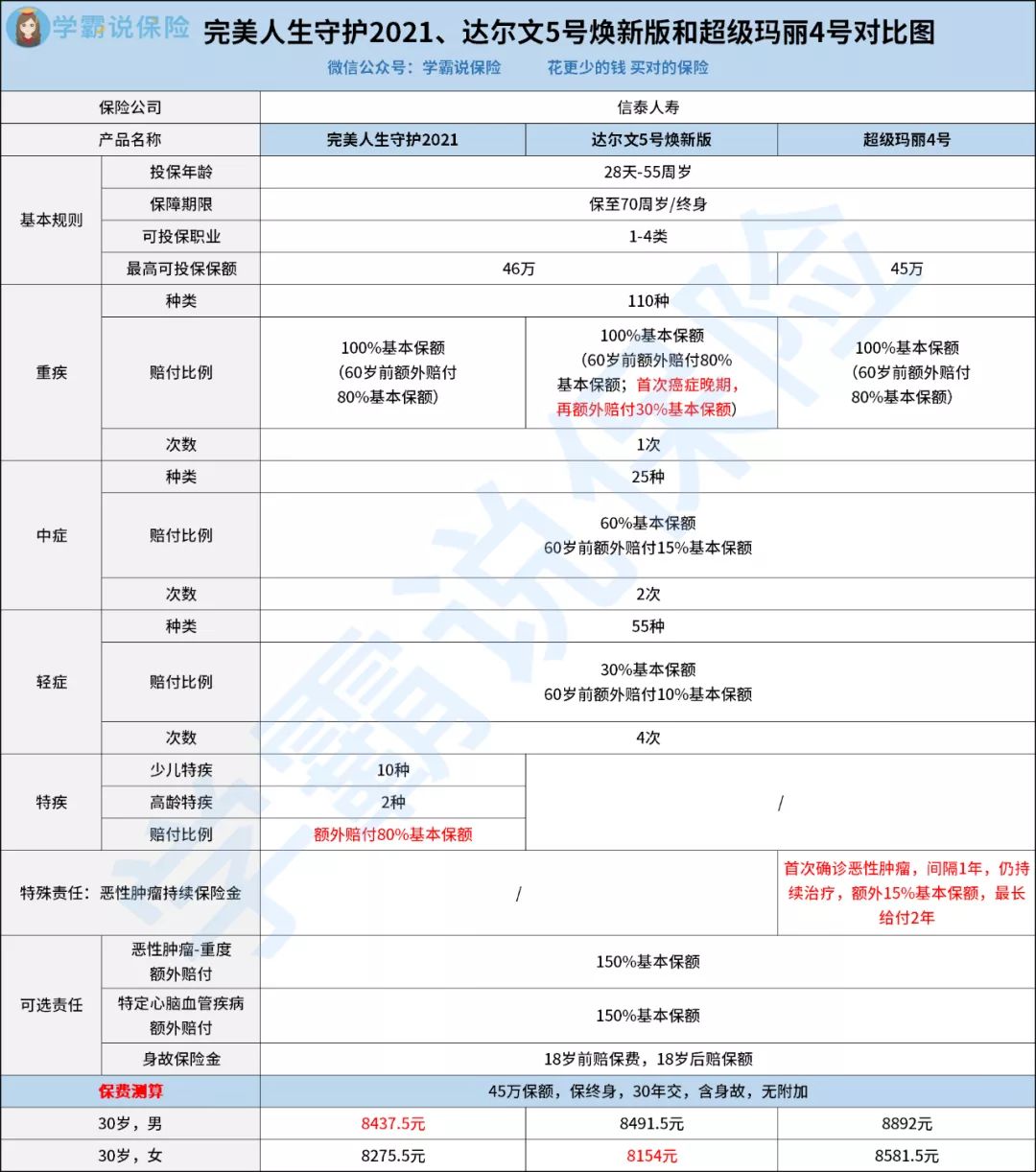学姐事先奉上信泰完美人生守护2021与达尔文好换新版、超级玛丽4号重疾险的对比表: