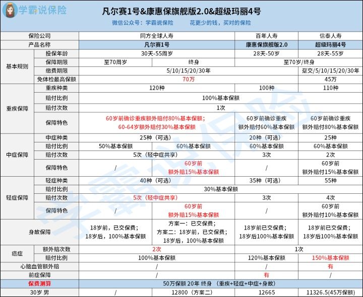 这三款产品都自带额外赔付责任,凡尔赛1号和超级玛丽4号在60岁前确诊重疾额外赔付80%,高于市场水平。但凡尔赛1号在60-64岁前还能拥有30%额外赔,并且轻症的额外赔水平更高,所以在赔付力度上,凡尔赛1号完胜!