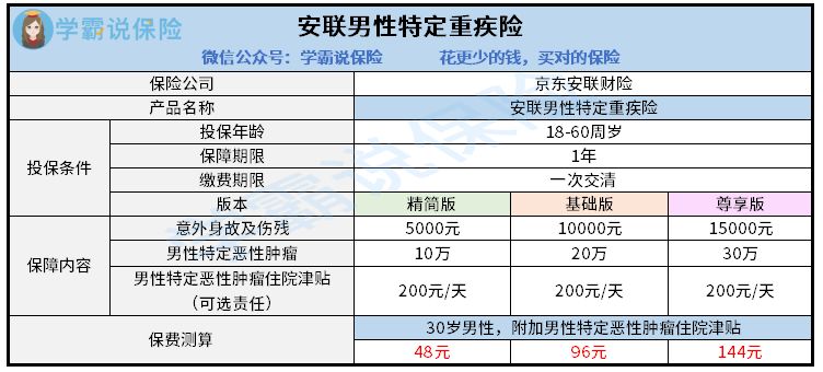 安联男性特定重疾险是京东安联财险旗下的一款一年期男性特定疾病重疾险,保障期限仅有一年。