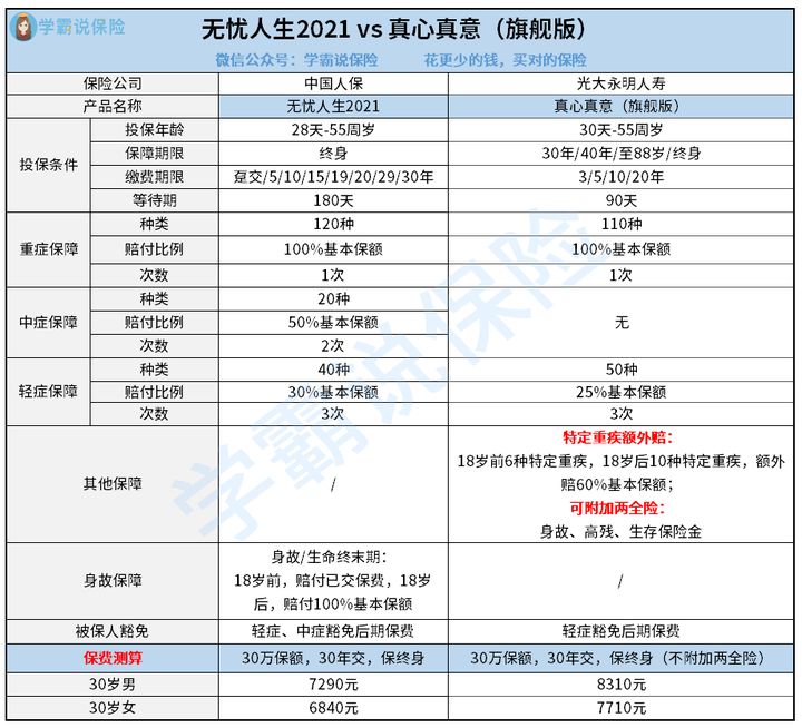 在相同条件下,30岁男性,买30万保额,分30年缴费,保障终身,无忧人生2021一年保费要7290元,而真心真意(旗舰版)则要8310元,相比之下,无忧人生2021的保费更加便宜,而且是涵盖了身故保障,性价比更高一些。
