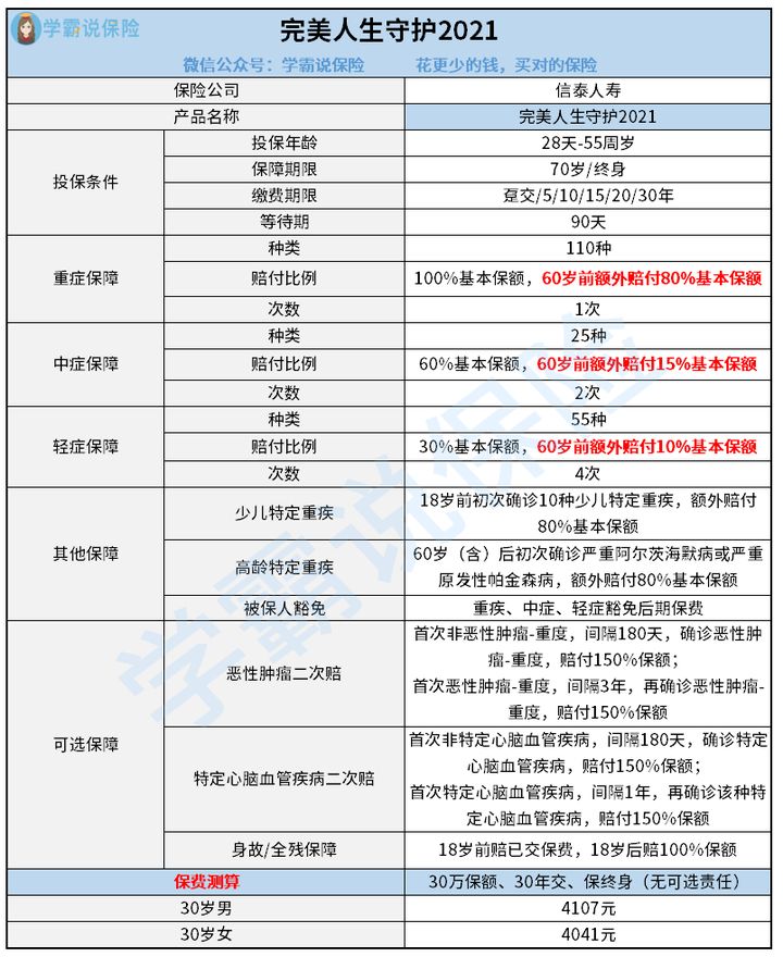 总的来说,完美人生守护2021的保障内容很全面,赔付比例高,性价比也高,是一款不错的重疾险。