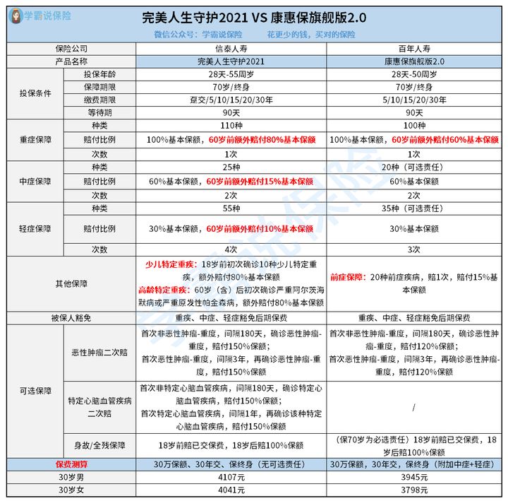 学姐找了市面上热销的康惠保旗舰版2.0与完美人生守护2021做下对比,看下哪个更值得买:
