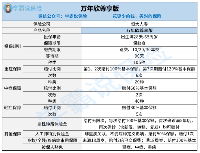 恒大人寿的万年欣尊享版是一款终身重疾险,只保终身,没有其他比如保至70岁/80岁的定期保障期限可选。