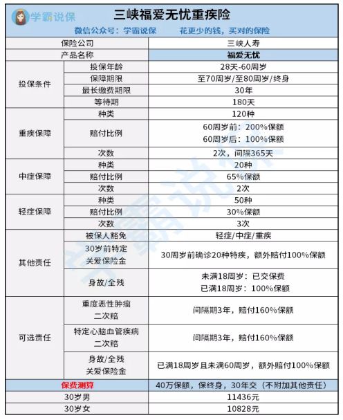三峡福爱无忧是一款保障全面、赔付力度强的重疾险产品;但是它保费较高,更适合预算高,追求全面保障的朋友。