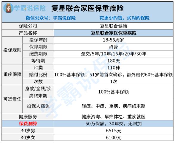 下面就来测算下家医保重疾险的保费,在50万保额、30年交且无附加的情况下,30岁男性投保家医保重疾险的保费为6515元。