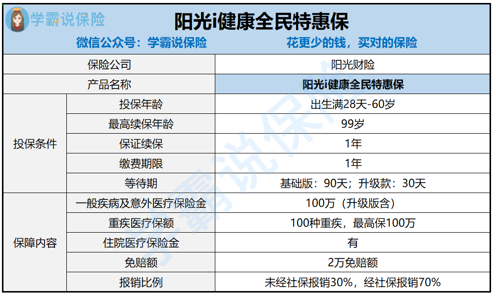 学姐可是听说阳光i健康全民特惠保很贴心,为消费者提供基础版和升级版,保费最低只要30元起。