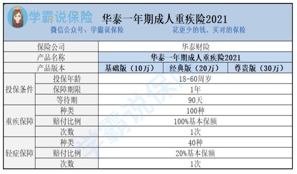 华泰一年期成人重疾险2021分三个版本,但最高保额也仅为30万。