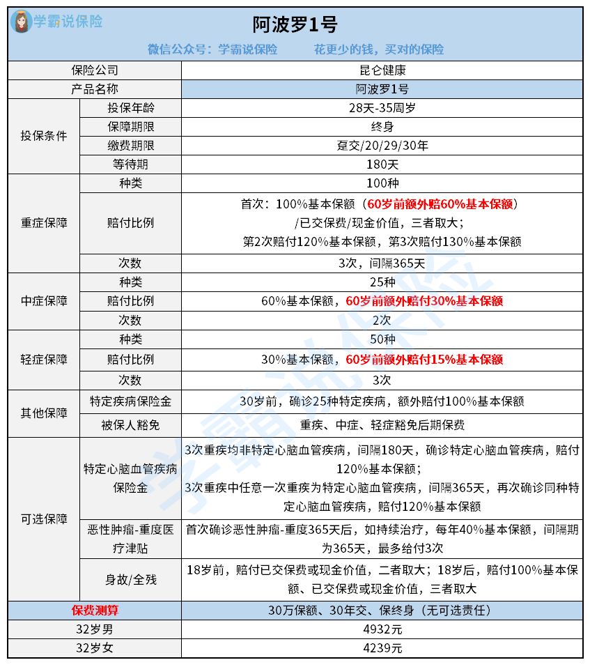 昆仑阿波罗多次赔重疾险全网最全测评来了,买前必看!weixin.qq.275.com综合来说,阿波罗1号的保障内容全面,重疾、中症和轻症的赔付比例都很高,可自由选择附加高发重疾保障,是一款优秀的重疾险,对于35岁以下的人群还是很值得买的。