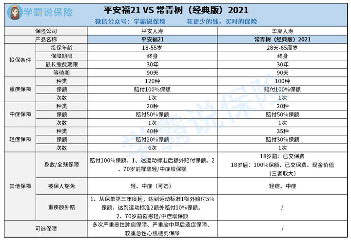 二、平安保险和华夏保险,谁的产品更有优势?学姐分别挑了平安人寿旗下的平安福21重疾险和华夏保险旗下的常青树(经典版)2021重疾险。