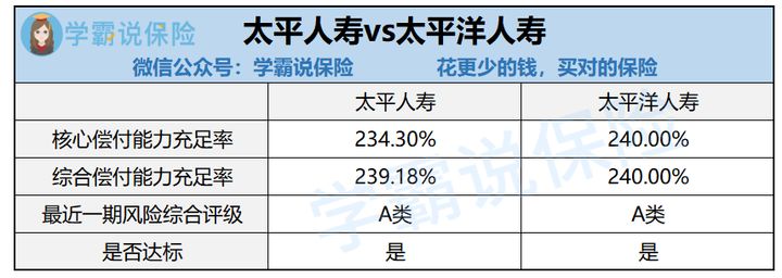 可以看到,太平人寿和太平洋人寿两家保险公司的偿付能力都是达标的,且不相上下。也就是说,这两家险企都是靠谱的,消费者在选择保险产品时无需过分担心能不能理赔这个问题。