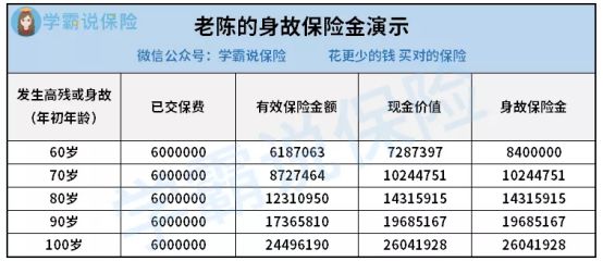 由上图可以看到,60岁时老陈的身故保险金是840万,减去已交的600万保费,如果老陈不幸逝世,家人能获赔280万身故金。