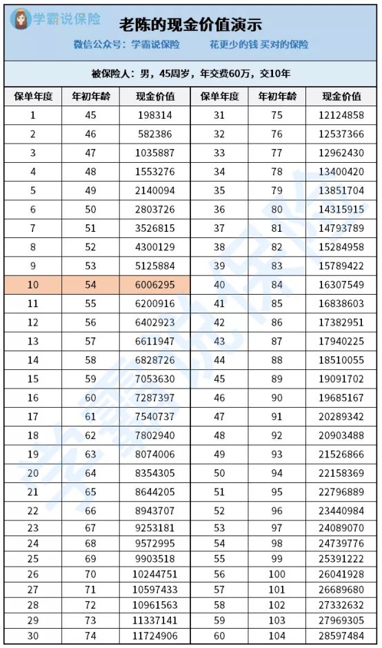 由上图可看到,在老陈54岁,也就是保单第10年,岁添福的现金价值已经超过了所交保费600万,实现回本。