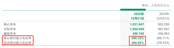 核心偿付能力充足率为260.1%、综合偿付能力充足率为268.92%、风险综合评级A级,远超及格线了。