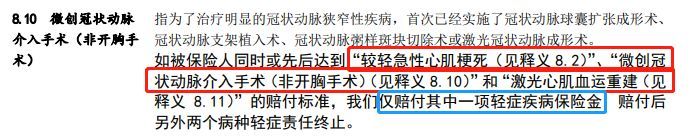 比如“较轻急性心肌梗死”、“微创冠状动脉介入手术(非开胸手术)”和“激光心肌血运重建”三者只能赔付其中一项。