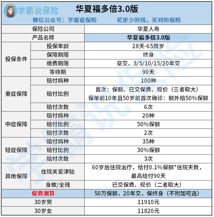 华夏福多倍3.0版包含重疾、中症跟轻症等基础保障,涵盖了住院关爱津贴跟身故/全残保障。
