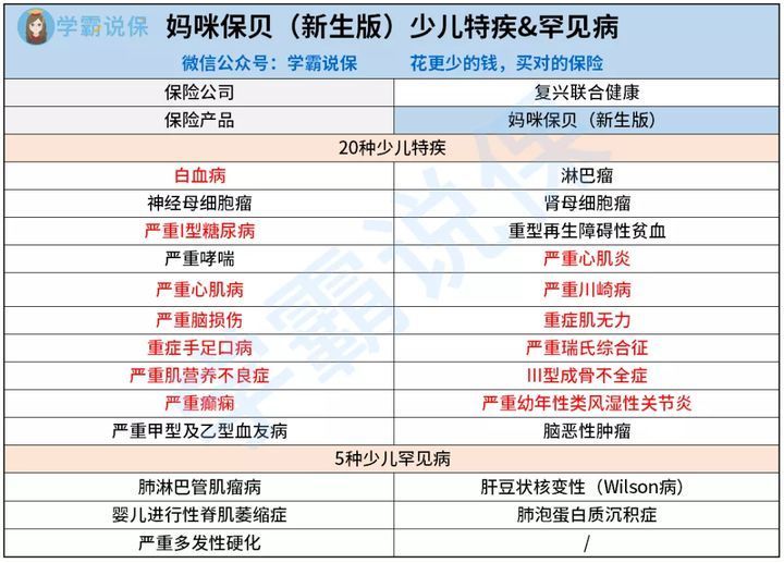 学姐将妈咪保贝新生版保障的20种少儿特定疾病和5种少儿罕见疾病整理在下图了,大家可以看看: