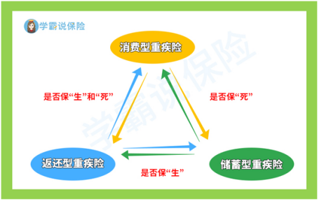 储蓄型重疾险和消费型重疾险、返还型重疾险构成了重疾险的全部种类,下面一图可以了解三种重疾险的区别,也可以让大家快速get储蓄型重疾险的独特之处: