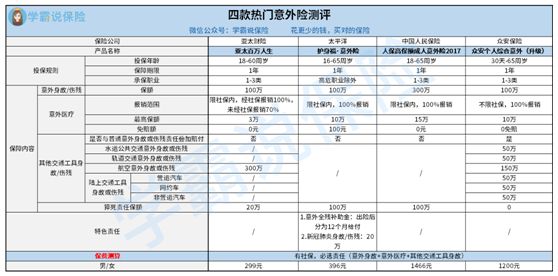 我找了四款保障内容比较全面、不同价格的意外险,大家可以看一下: