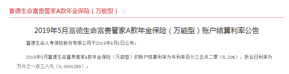 富贵管家A款年金保险(万能型)的保证最低利率是2.5%,此外根据2019年5月,富德生命富贵管家A款年金保险(万能型)的账户结算利率为年利率百分之五点二零(5.20%),可见下图告示: