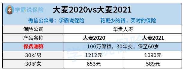学姐测算了大麦2021与先前的大麦2020的保费如下: