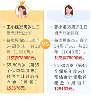 以宣传页面上的演示案例为例,25岁女性每周投保50元,到55岁领取,一直领到80岁,相当于每年交2600,55周岁以后,每年领取6142.8元,实际年收益率仅有2%,还不如买5年期的国债收益率高。