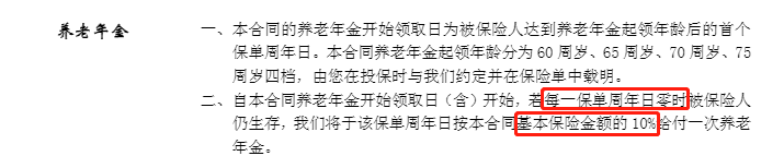 养老金领取年龄分为60周岁、65周岁、70周岁、75周岁四个档次,养老年金开始领取日是被保人达到养老年金起领年龄后的首个保单周年日。每一保单的周年日零时被保人还生存,则按合同基本保险金额的10%给付一次养老年金。