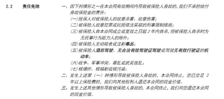 免除责任包含的几项都是比较常规,只要不是违规违法,酒后驾驶等导致的身故都可以获得身故保障金。