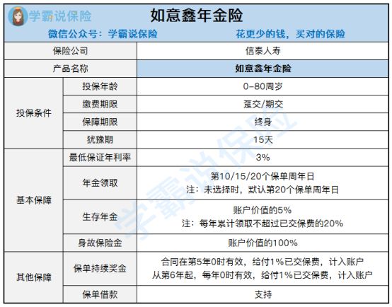 其实说到年金险产品,相信很多人都很陌生,今天学姐就来给大家科普科普。下面以信泰人寿的如意鑫年金险产品为例,开始学姐的show time!