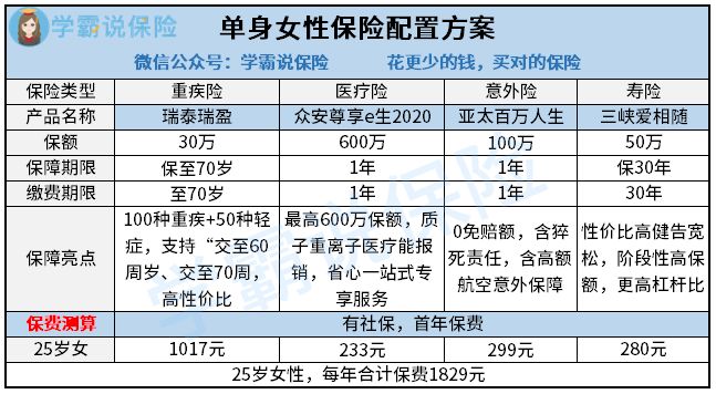 单身女性,应以多保障自己为前提,可选择保费较低的纯保障型产品,尤其是对重大疾病、住院医疗以及意外的保障。针对这部分人群,学姐做了以下这个单身女性保险配置方案: