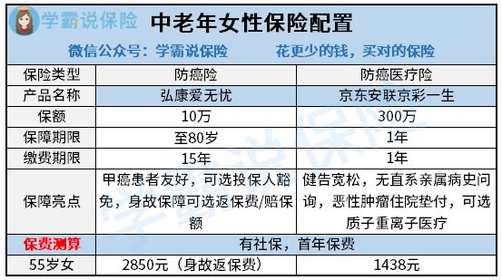 这个年龄段的女性已经过了家庭主要经济支柱的阶段,那么购买寿险的必要性就不是很大了,而且由于身体原因还很有可能过不了重疾险和医疗险严格的健康告知,所以学姐就重点说一下重疾险和医疗险的低配版——防癌险和防癌医疗险怎么买吧~