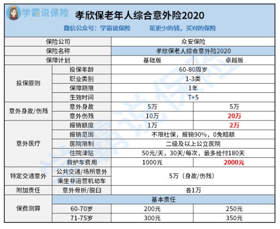 从上图我们能看出,孝欣保老人意外险2020有两个版本:基础版和卓越版。投保年龄都为60-80岁,适用的职业为1-3类,保障期限为1年。