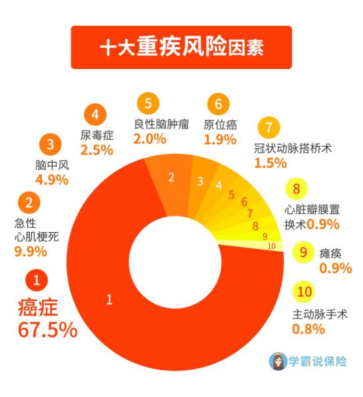 二、我们这一生会面临哪些风险?重疾险风险:首先来看一张图,我们可以看到十大重疾风险因素包括癌症、急性心肌梗塞等。其中,作为人类第一健康杀手的癌症位居第一。