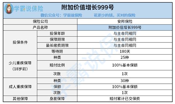 一、价值增长999号重疾险让我们先来看一下这款至今还能续保的附加险: