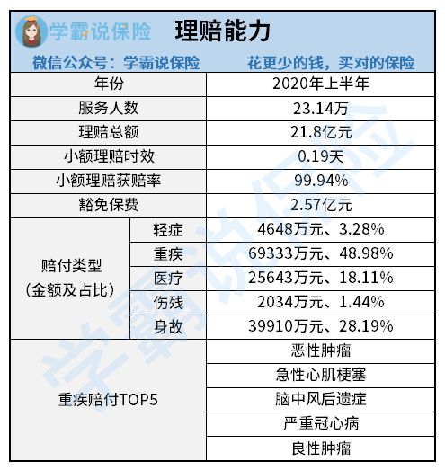 由图可见,2020年上半年共服务23.14万人次,理赔总额达21.8亿元,小额理赔时效为0.19天,小额获赔率为99.94%,共豁免2.57亿元保费。