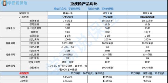 从学姐的角度来看,这三款产品的性价比都很低,比市面上的大多数同类产品贵2-3倍。这三款中唯一还能拿出来说一说的是中英人寿的守护2019,重疾不分组赔2次,但是它的保费也是最贵的,30岁男性缴费高达接近一万五,还要交30年,保额才50万,所交的保费大概等于保额,基本上没有杠杆了。不仅如此,这三款保险在保障方面都做得十分差劲: