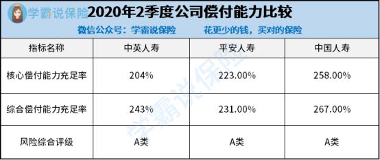 出乎意料的是这三家保险公司的偿付能力都远远超过合格线,并且风险综合评级都是A。可以说,这几家公司的产品都可以放心地购买,不用担心公司倒闭的风险。