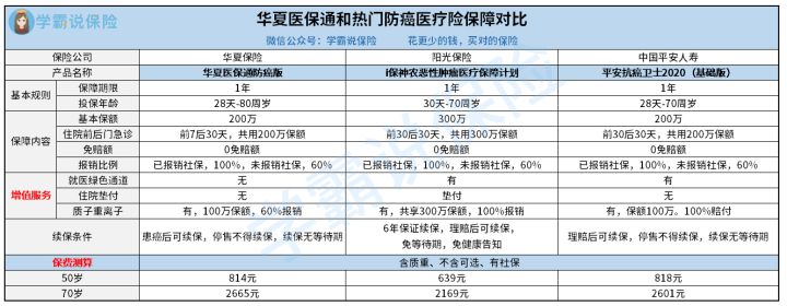 华夏这款医保通有好多版本啊,什么普惠版、旗舰版,看得我眼都花了,血书求求这些公司起名字走点心!这款防癌版,其实就是防癌医疗险,也是现在比较热门的保险类型,也是专门针对身体不太好或者是老人家的,毕竟它的健康告知是真的宽松。不过话说回来,这款医保通到底够不够神通呢?我们先看看它可热门医疗险的全面对比: