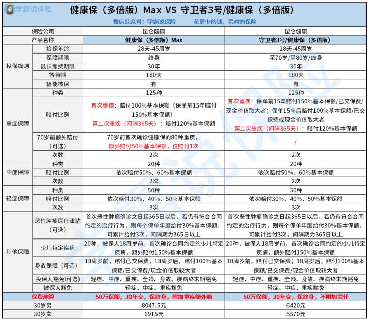 开头也给大家说到,健康保多倍版Max重疾险其实就是守卫者3号的升级版,为了让大家有更直观的了解,学姐直接把他们放在一起对比: