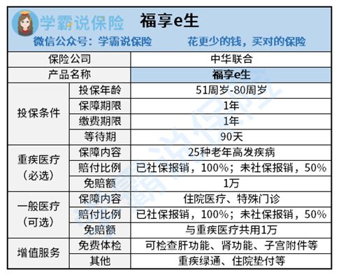 二、产品分析:福享e生中华联合保险在售产品数量繁多,但是健康保险卖得不多。其中,联合福享e生是它家的中老年人专用医疗险,至于产品怎么样,请看图: